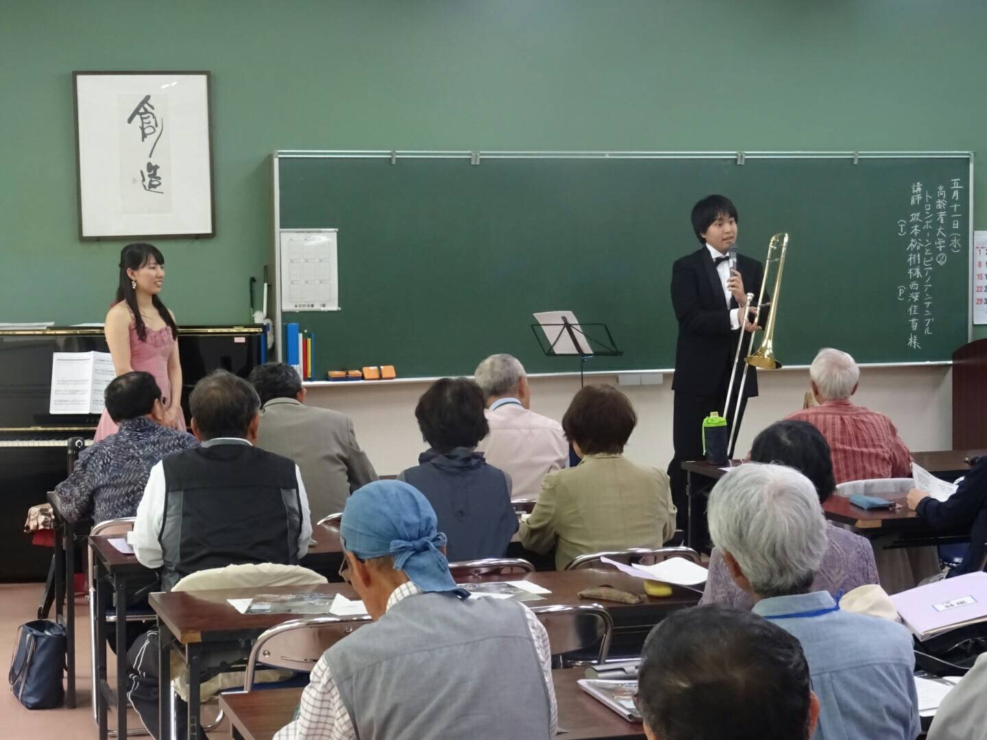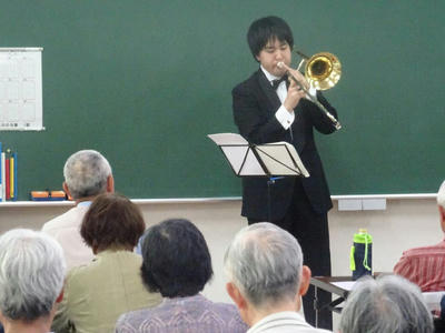 今日は高齢者大学に通われているみなさんにトロンボーンとピアノの演奏を聴いていただきました。