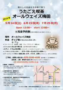 毎月定例イベント♪7月25日(月)うたごえ喫茶です♪今回はザ・ピーナッツ、永六輔の曲を中心にみんなで楽しく歌いますよー♪